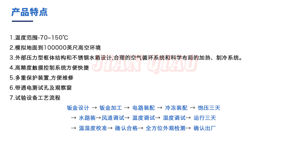 產(chǎn)品型號:JQTA-504 品牌:劍 喬 用途:高低溫低氣壓試驗箱主要用于試驗工件在低氣壓、高溫低溫單項或同時作用下的環(huán)境適應性與可靠性試驗,并或同時對試件通電進行電氣性能參數(shù)的測量。咨詢熱線:13829135130