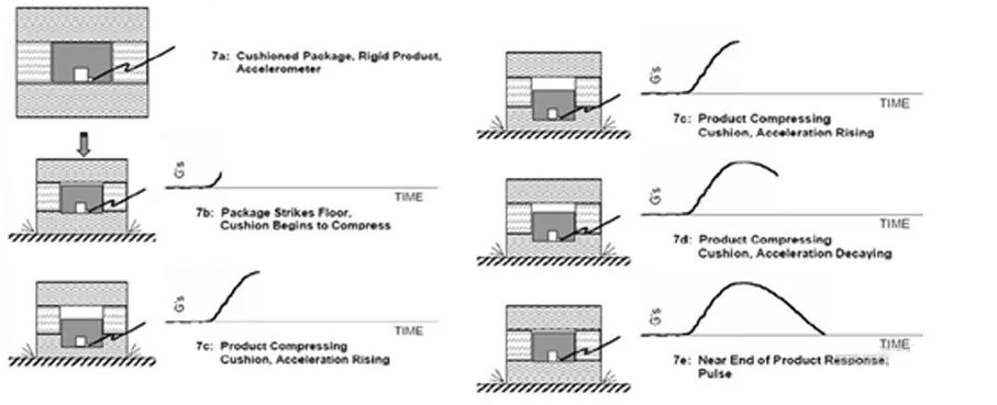 我們把產(chǎn)品受到?jīng)_擊一瞬間的整個過程分解開來,產(chǎn)品受到?jīng)_擊的過程大致如下圖,通過下面的圖片我們可以清晰的感受到產(chǎn)品受到撞擊或者跌落的一瞬間產(chǎn)品被壓縮,再把應(yīng)力釋放的整個過程:
