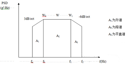 為了簡便起見,往往將功率譜密度曲線圖劃分成若干矩形和三角形,并利用上升斜率(如3dB/oct)和下降斜率(如-6dB/oct)分別算出wa 和w2,然后求各個幾何形狀的面積與面積和,再開方求出加速度總均方根值。